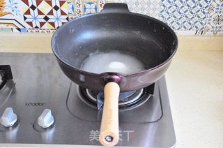 3- Đổ bột ra, cho nước và đường vào chảo, đun nhỏ lửa, khuấy đều, lúc đầu nổi nhiều bọt nhỏ.