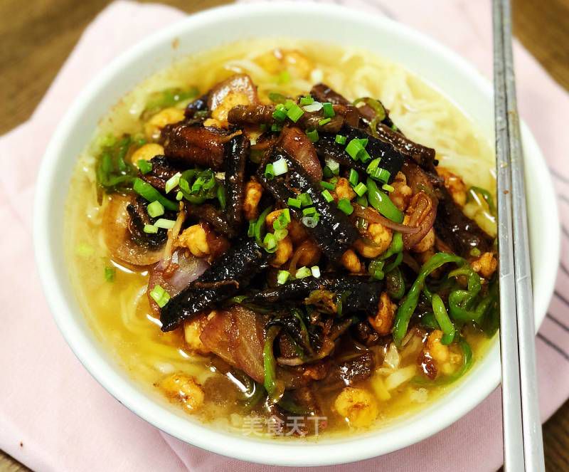 13- Cuối cùng, rắc chút tiêu, cho hành tây và ớt xanh vào xào, rưới dầu mè lên. Đổ lên tô mì, rắc hành lá xắt nhỏ.