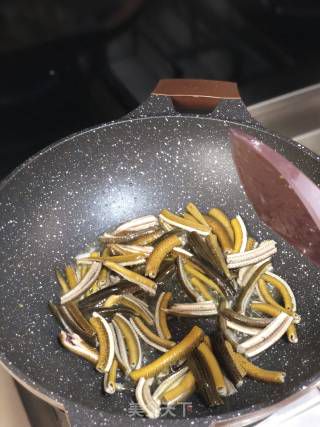 8- Cho một ít mỡ lợn vào chảo, đổ lươn vào xào, sau đó thêm gừng, tỏi.