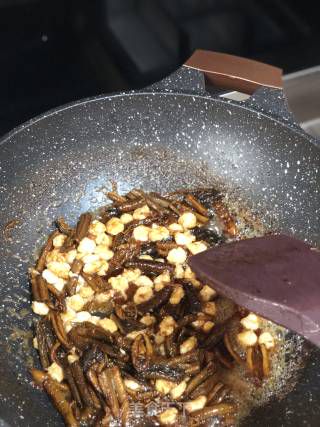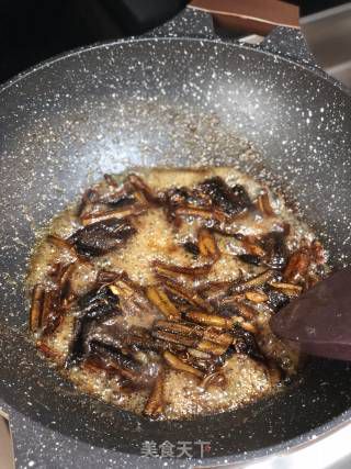 9- Đến khi thịt lươn khô lại, thêm rượu nấu ăn, nước tương, nước tương đen, đường và một chút muối vào, đảo đều, sau đó cho một lượng nước vừa đủ vào đun ở lửa vừa khoảng 5 phút.