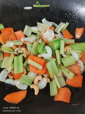 6- Cho dầu vào chảo để sôi, cho cà rốt, cần tây vào xào, thêm ít muối, xào thêm 2 phút nữa, thêm bách hợp vào xào 5 phút.
