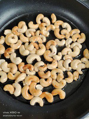 1- Bắc chảo lên, cho dầu đậu phộng vào, thêm hạt điều vào xào, đảo liên tục để tránh hạt điều bị cháy. Xào đến khi vàng hai mặt là được.