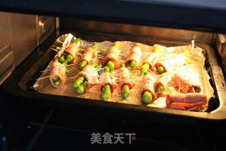 5- Cuộn thịt với một đến hai đoạn măng tây, cuộn mặt có rắc tiêu vào bên trong, dùng tăm cố định (quét một lớp dầu lên giấy bạc để chống dính).