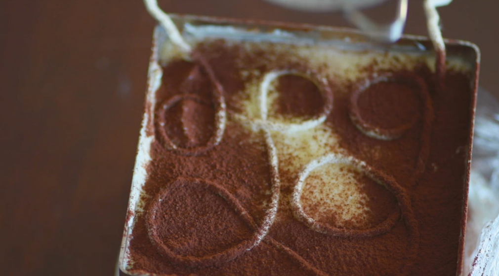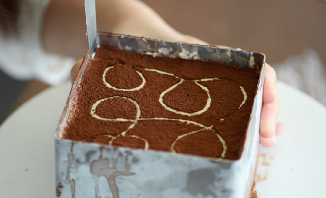 5- Mẹo trang trí: Dùng dây cotton quấn thành từng vòng hoặc chữ lên bề mặt bánh, sau đó rắc bột cacao lên.
