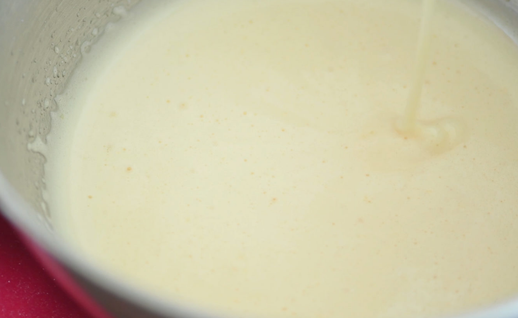 2- Cho hỗn hợp vào máy đánh trứng, đánh cho đến khi đặc lại.