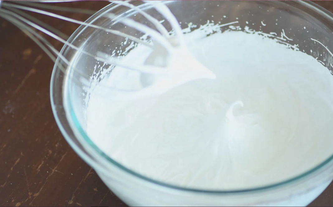 2- Thêm từ từ lòng trắng trứng vào đường, dùng máy đánh trứng đánh bông.