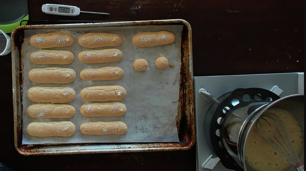 1- Làm nóng lò nướng ở 200 độ C. Lót giấy nến trong khay nướng, kẻ vạch tùy theo khuôn làm tiramisu, của tôi là 11cm.
