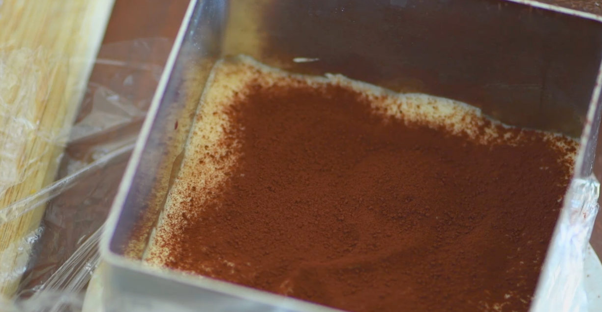 3- Dùng muỗng múc nhân tiramisu vào khuôn, một lớp dày khoảng 1cm, rắc bột cacao lên trên. Lặp đi lặp lại bước này đến khi đầy khuôn, hoặc đến độ cao bạn muốn.