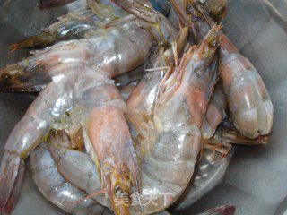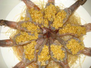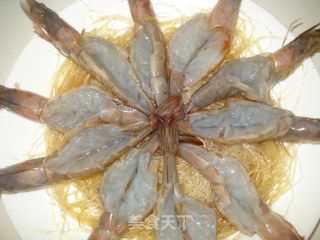 5- Sắp miến lên đĩa. Chẻ đôi tôm, bỏ sống lưng, đặt lên trên miến.
