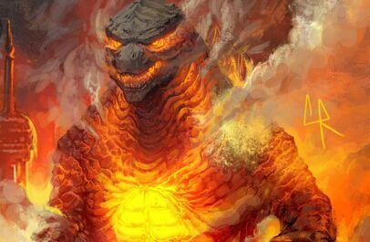 As Shin Godzilla stood motionless, resting to recuperate his energy, he is unaware of a fuming figure rising from the flames, his entire body burning with crimson nuclear energy.