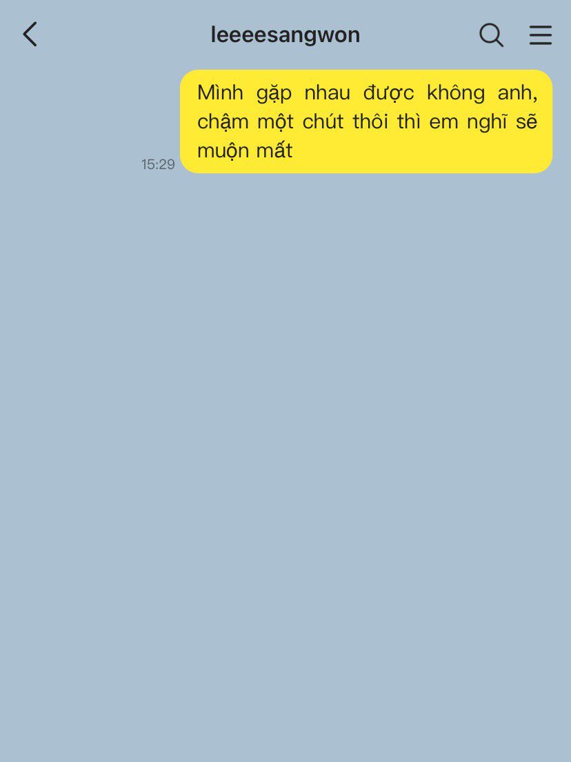 Sangwon vẫn chết trân trân, cơ thể em run cầm cập như thể đang trong cơn rốt rét. Bỗng Sangwon nhớ ra gì đó, em bật dậy như con tôm, bàn tay run rum mở vội Kakaotalk, lướt xuống một tin nhắn cuối cùng mà em đã không dám đọc lại từ rất lâu, lâu tưởng chừng như nó đã phủ một lớp bụi.