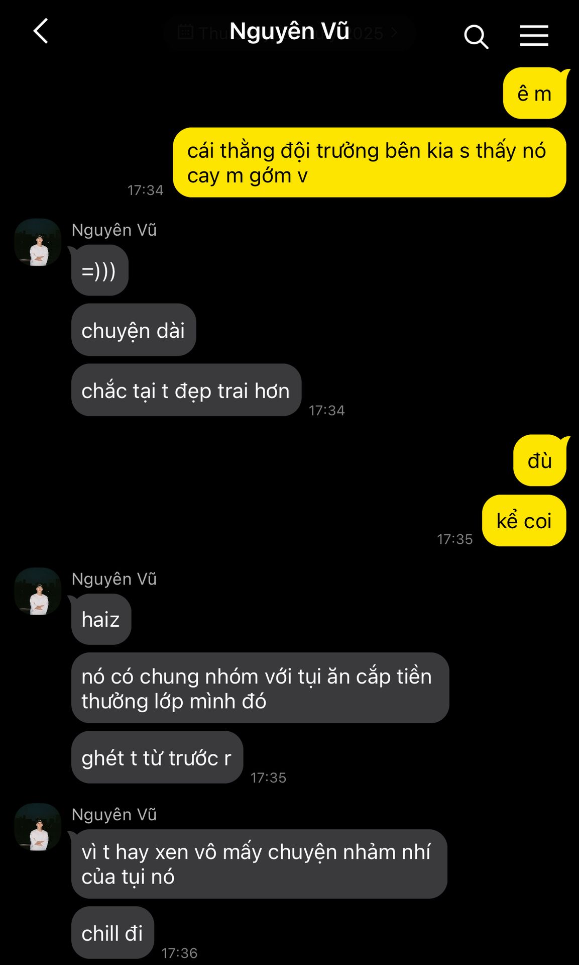 Cậu nam sinh đang đối đầu với Vũ, đội trưởng của nhóm trường bên buông tay khỏi cổ áo Nguyên Vũ, kéo tụi lưu manh bốc đồng kia về lại ghế đá giải lao bên ngoài.