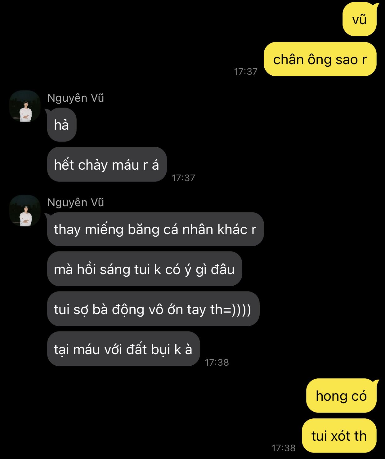 " ấy ấy đừng- đừng đụng vô chỗ này.. nó bẩn, Vũ không đau lắm đâu. " Vũ nắm nhẹ cổ tay cô, không hẳn là gạt phăng ra, cậu không nhìn cô, chỉ tự mình thổi thổi vết thương đang chảy máu và dính nhẹ ít đất sân bóng do ngã.