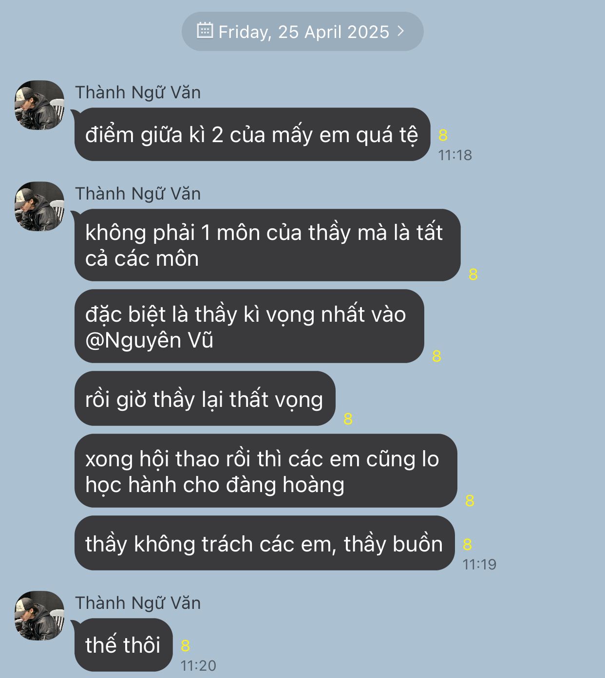 Hôm nay, thầy Thành cũng không hay cười nữa, chỉ tập trung cầm cuốn sách và viết phấn lên bảng. Vũ thì đang gật gù trên cuốn sách, có lẽ tối qua vì học quá khuya mà quên giờ giấc, bên cạnh còn có vài đứa đang nói chuyện xì xầm cũng không quan tâm lắm. Yn biết cậu đang mệt, cũng không dám làm phiền, mặc dù tiết toán sắp tới sẽ bắt đầu giải vài bài mà cô chưa hiểu.