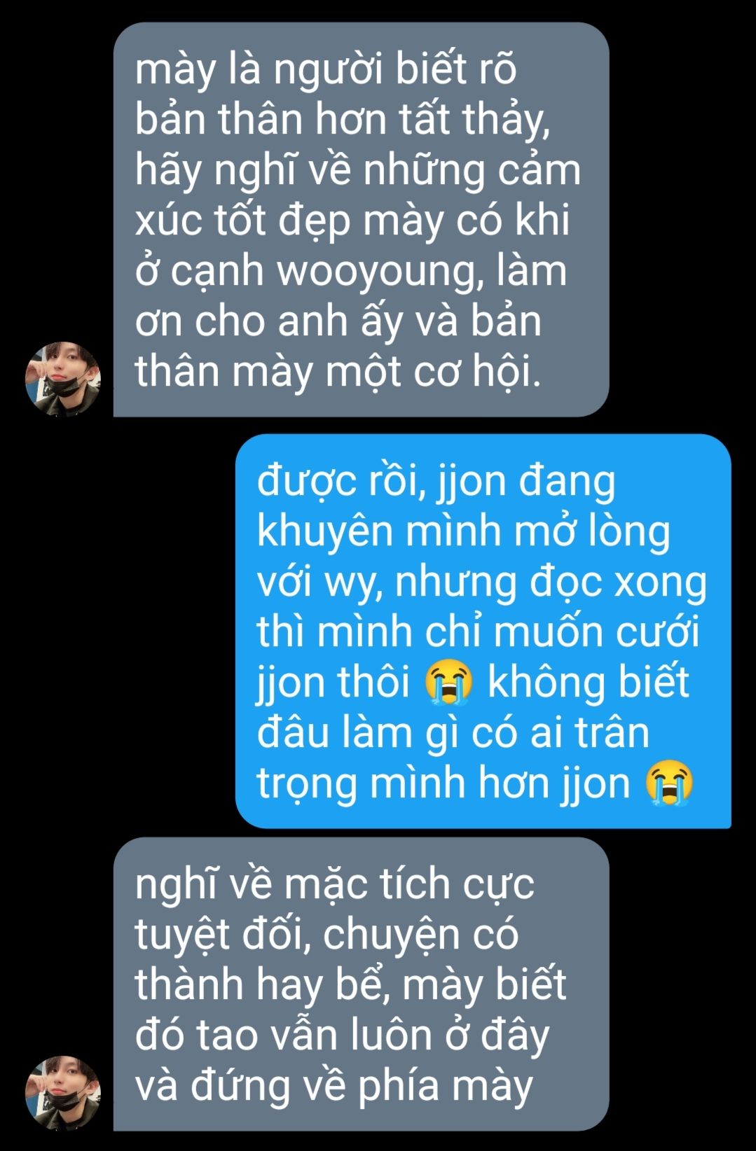 - thừa nhận là anh đang rất muốn hôn em, đúng hơn là anh luôn muốn hôn em, nếu hôm nay là một ngày khác cũng trong tình huống này anh đã hôn em rồi ngay cả khi anh sẽ bị còng đầu sau đó đi chăng nữa, nhưng hiện tại thì anh không mong em bị lây cảm.