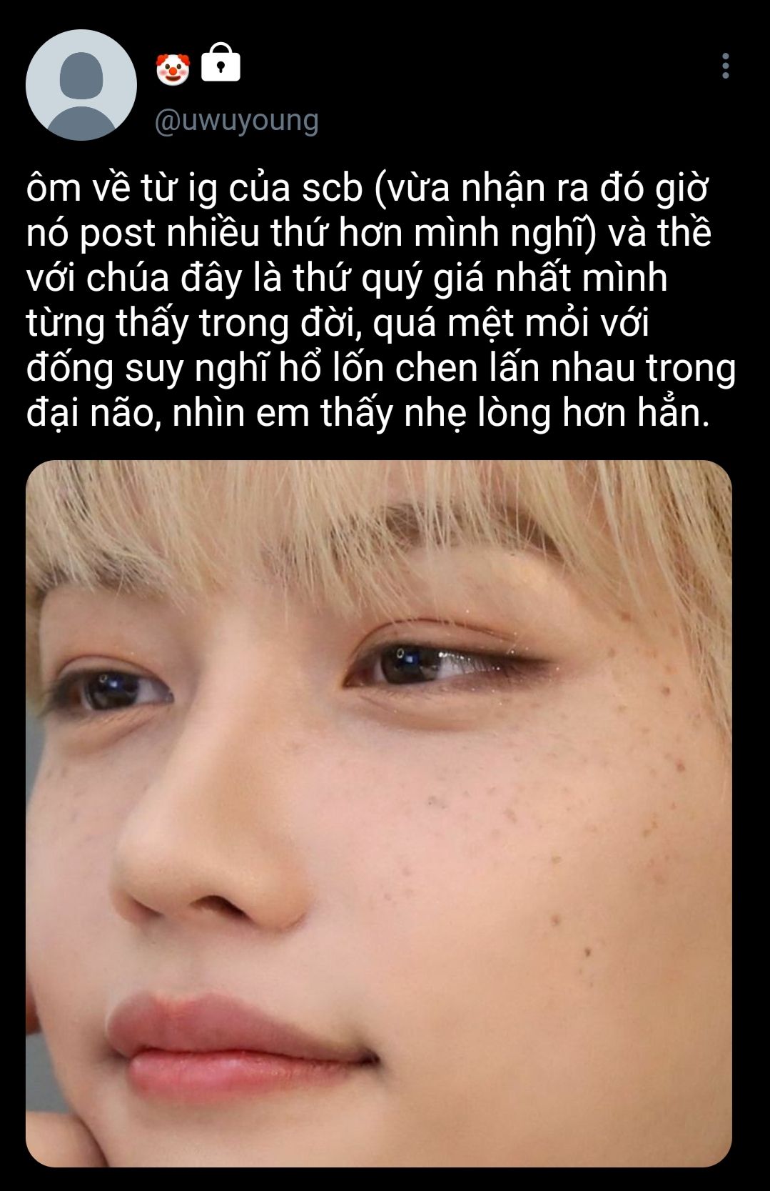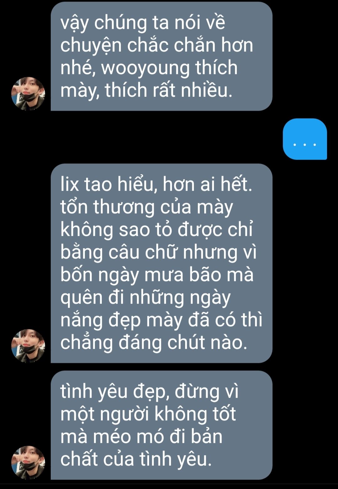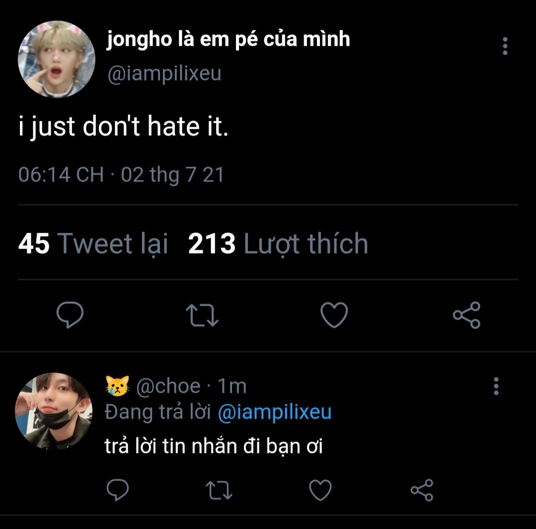 felix không nghĩ quá nhiều. em thấy những thứ wooyoung tweet và vài story instagram, đoán là anh đang gặp chút rắc rối gì đó. dạo này sức khoẻ của anh cũng không tốt. wooyoung chắc là không có ý khiến em mất tự nhiên đâu, nhưng em mong wooyoung mở lòng tâm sự với em, như vậy sẽ tốt hơn. em muốn như vậy. em biết mình cần nói gì đó, tốt nhất là trước khi vịt con không trụ được nữa và tắt ngóm. vì nếu wooyoung cười, em mong là mình sẽ không bỏ lỡ, em nhớ nụ cười của anh chết mất thôi, kể ra mới tuần trước wooyoung còn đều đặn đưa em về nhà xong đứng nhìn theo cười ngốc ơi là ngốc.
