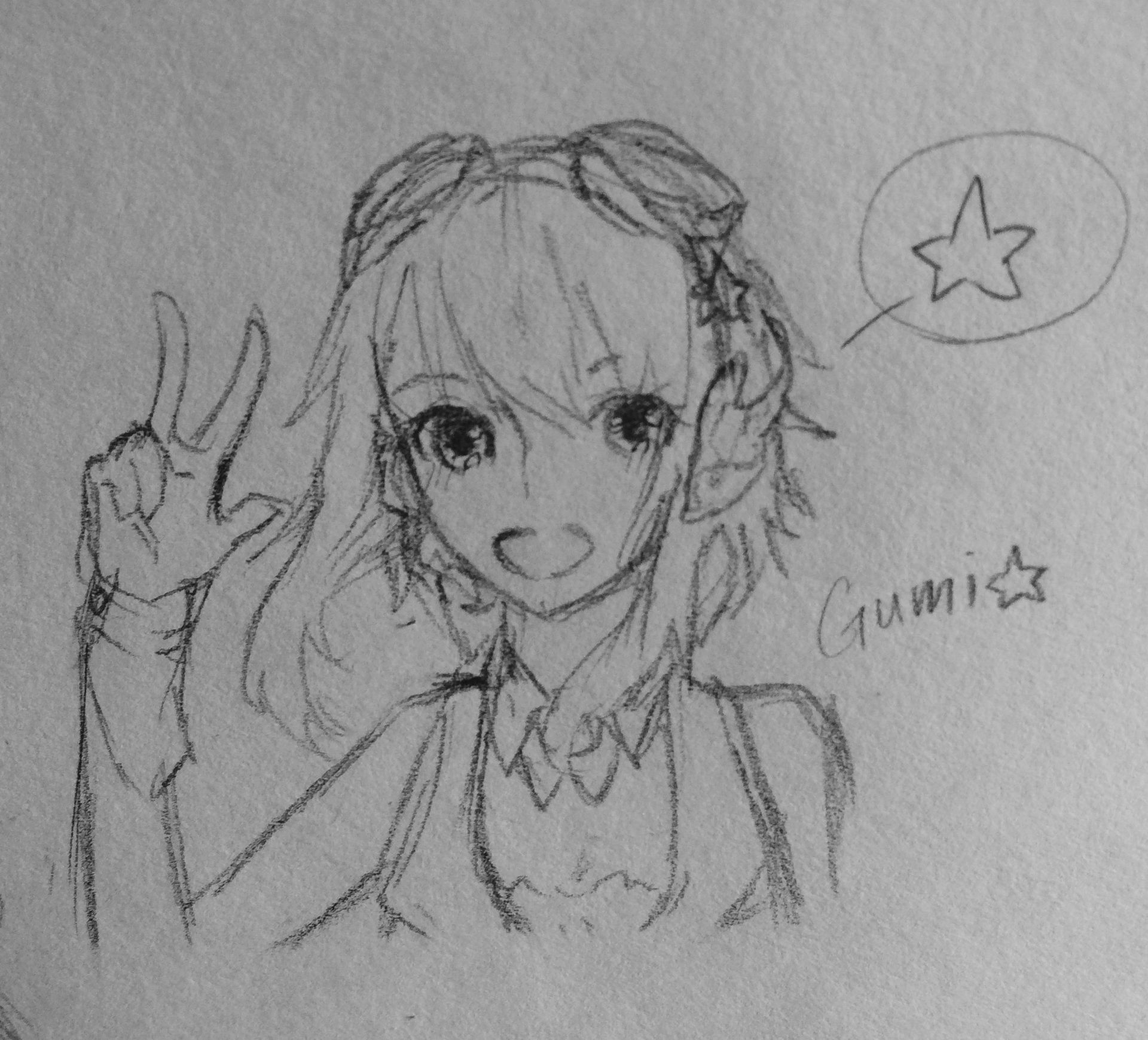 And finally, Sketch of Gumi! She's one of my most favourite vocaloid, mainly because her voice is the most... how should I say... normal? Well I guess. I can't really think of the right word. And she's my favourite for she sings main in Honeyworks and Mikagura... Anyhow, she's cute so listen to her songs!!