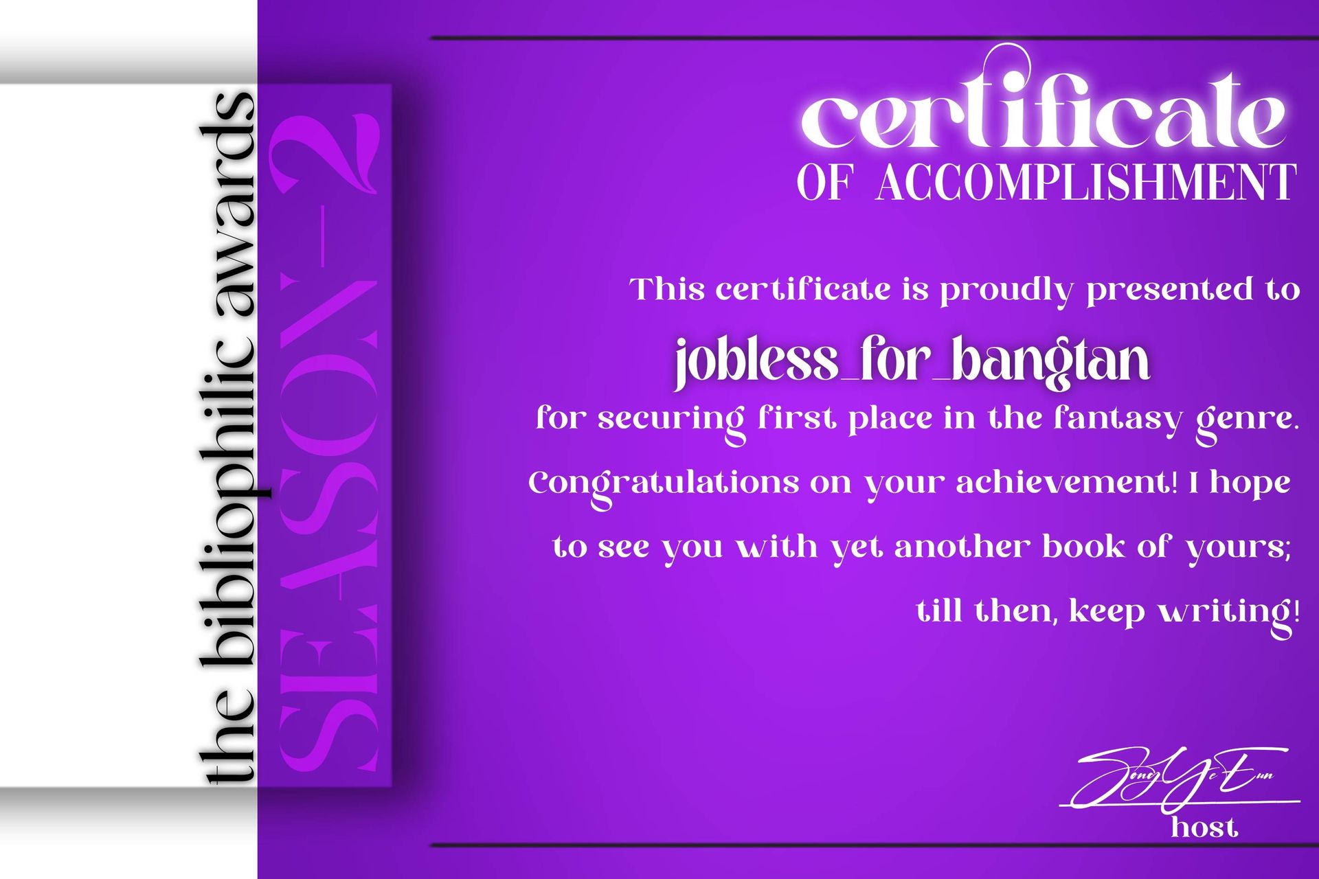 1st place in the fantasy category of Bibliophilic Awards season II hosted by SongYeEun2525