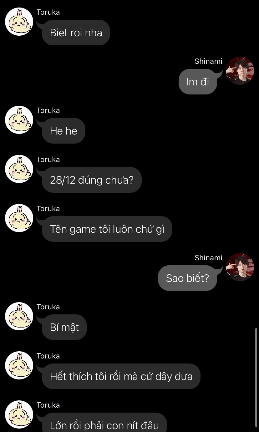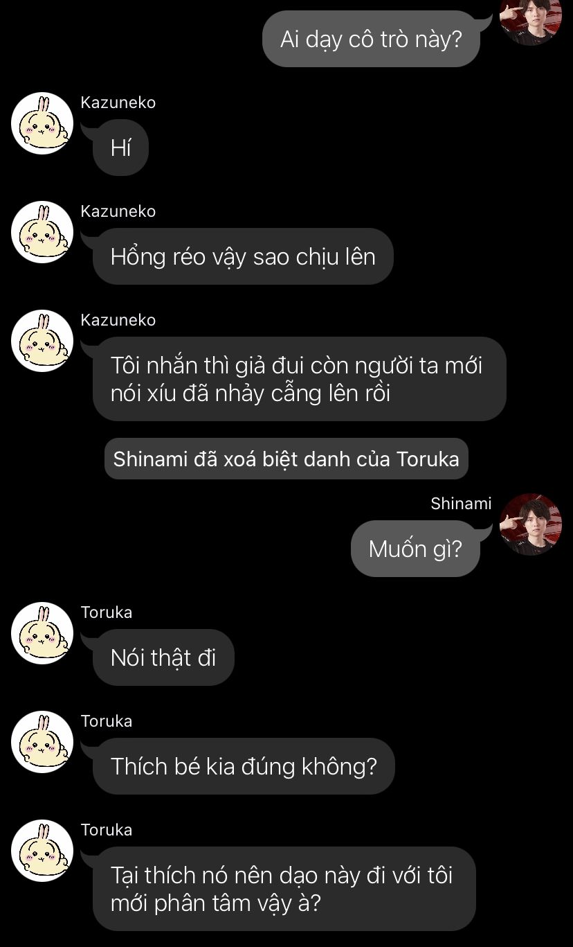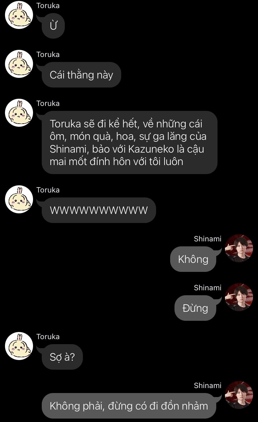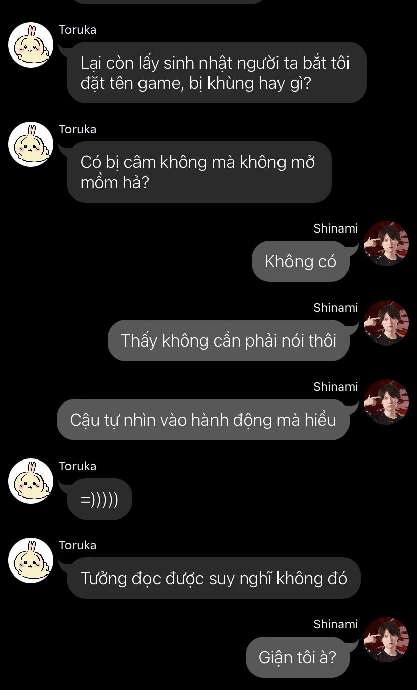 Mấy tin nhắn sau đó nữa là hết, không thêm gì, khoảnh khắc mà Toruka chọc ghẹo anh bằng cách đổi tên thành cậu nhóc đó, Shinami đã thấy rất mừng, định gửi là: