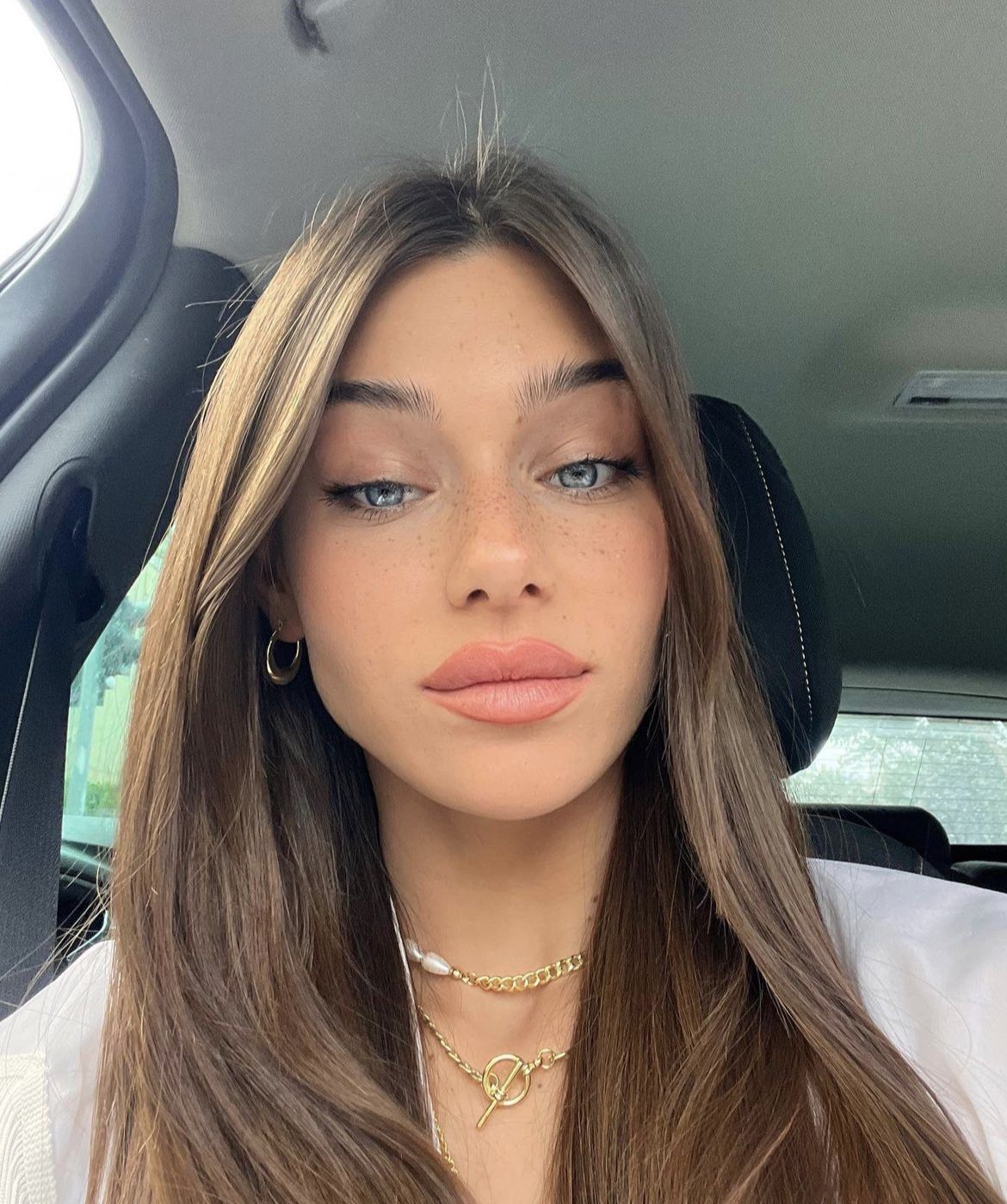 Brown hair, blue eyes, freckles, same smile as Charles, friendly experience, slime body figure, plump lips, slightly tanned skin.