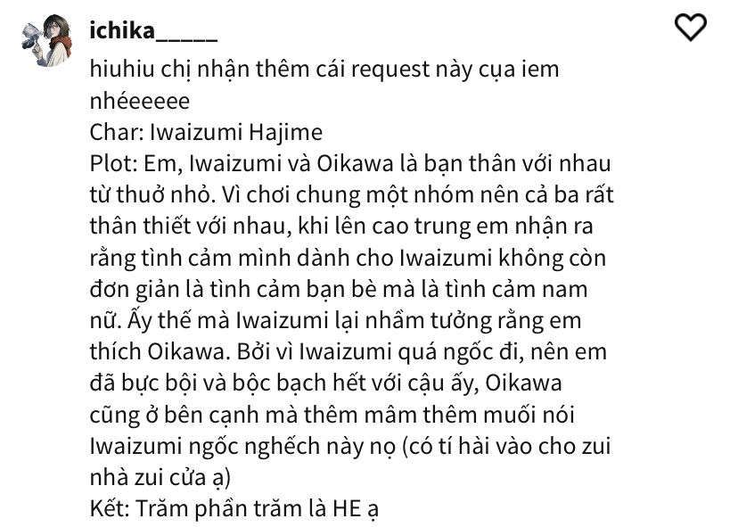 - "Kể ra Iwa-chan ngốc thật đấy, người ta rõ là thích cậu lâu như vậy mà cậu lại nghĩ Y/N thích tôi đã thế còn cho con nhỏ này vào Friendzone. Cậu ta tồi như thế mà cậu vẫn thích sao Y/N?" _ Oikawa giả bộ lấy khăn tay chấm chấm nước mắt ủy khuất.