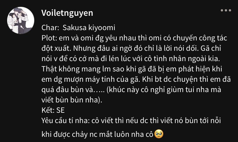 Vốn tưởng rằng sẽ là những tin nhắn giữa những người bạn với nhau. Nhưng em đã lầm, Sakusa anh ấy có người khác. Nước mắt bất giác trào ra, em không thể tin được rằng người chồng vẫn hết mực yêu thương chiều chuộng em vậy mà lại có nhân tình bên ngoài. Những lời yêu thương đường mật anh nói với em chỉ là giả dối thôi sao? Ngay cả "anh yêu em" cũng chỉ là lời nói anh thốt ra không mang chút trọng lượng nào sao? Vậy ra đó chỉ là vỏ bọc che đi cuộc hôn nhân mục nát với người chồng ngoại tình mà em luôn hết mực tin tưởng sao?